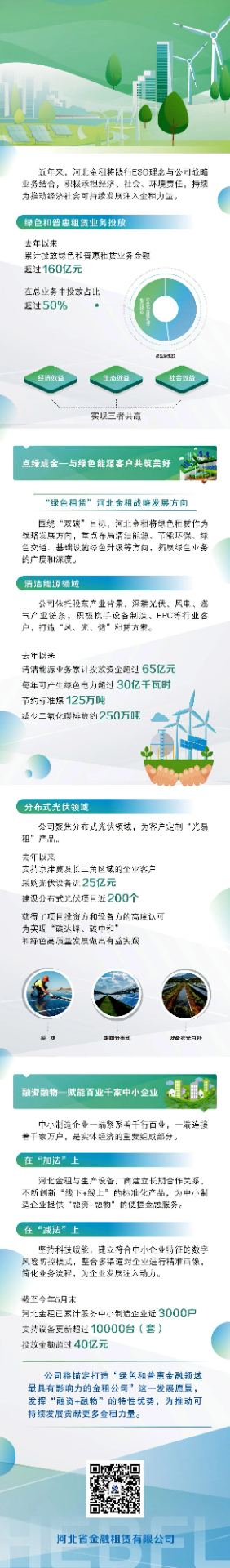 近年來(lái),河北金租將踐行ESG理念與公司戰(zhàn)略業(yè)務(wù)結(jié)合,積極承擔(dān)經(jīng)濟(jì)、社會(huì)、環(huán)境責(zé)任,持續(xù)為推動(dòng)經(jīng)濟(jì)社會(huì)可持續(xù)發(fā)展注入金租力量。去年以來(lái),累計(jì)投放綠色和普惠租賃業(yè)務(wù)金額超過160億元,在總業(yè)務(wù)中投放占比超過50%,實(shí)現(xiàn)經(jīng)濟(jì)效益、生態(tài)效益、社會(huì)效益三者共贏。
